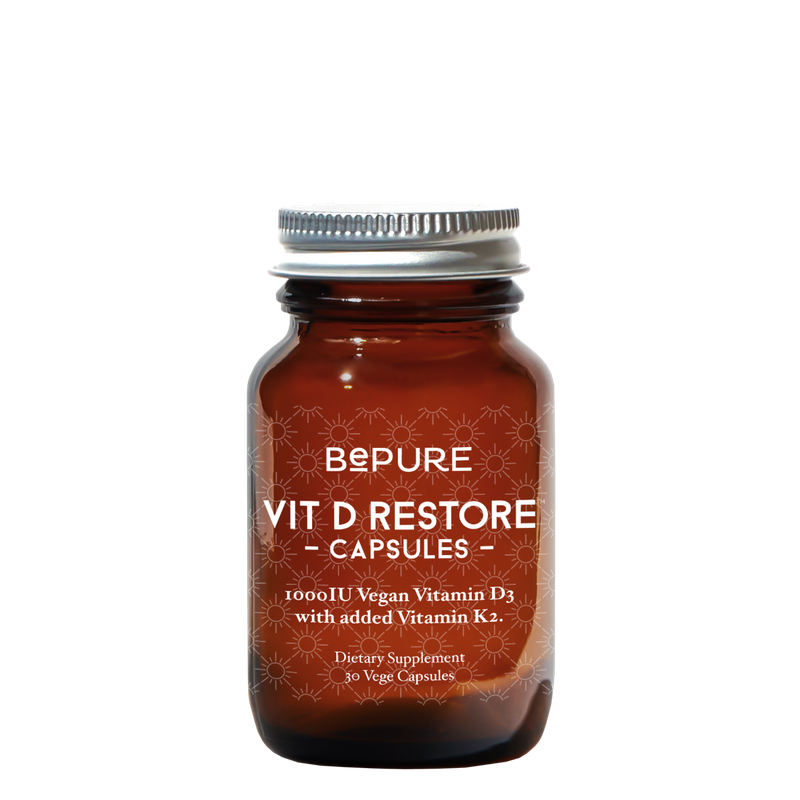BePure Vit D Restore Capsules contains high strength, plant-based vitamin D with vitamin K2, designed to support vitamin D levels for whole body health, energy and immune health.