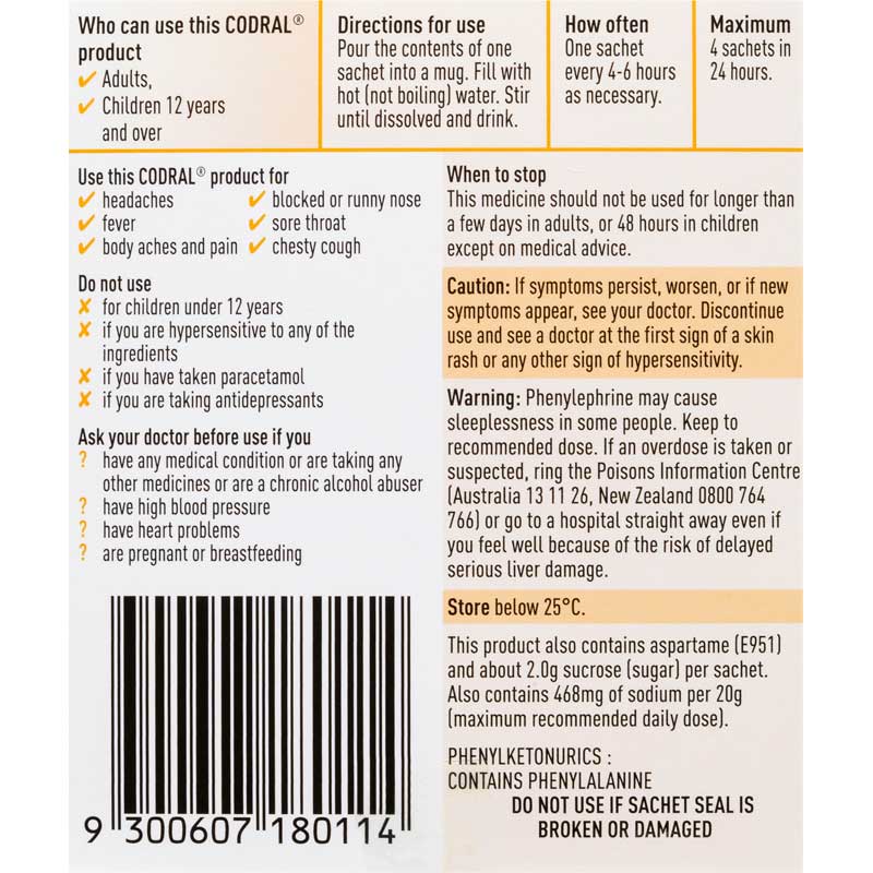 Use this Codral product for: - headaches. - fever. - body aches & pain. - blocked & runny nose. - sore throat. - chesty cough.