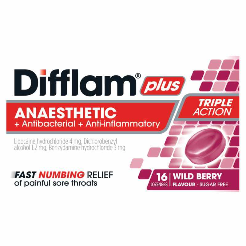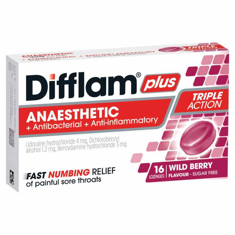 Difflam Plus Anaesthetic + Antibacterial + Anti-Inflammatory Sore Throat Triple Action Wild Berry Lozenges 16s