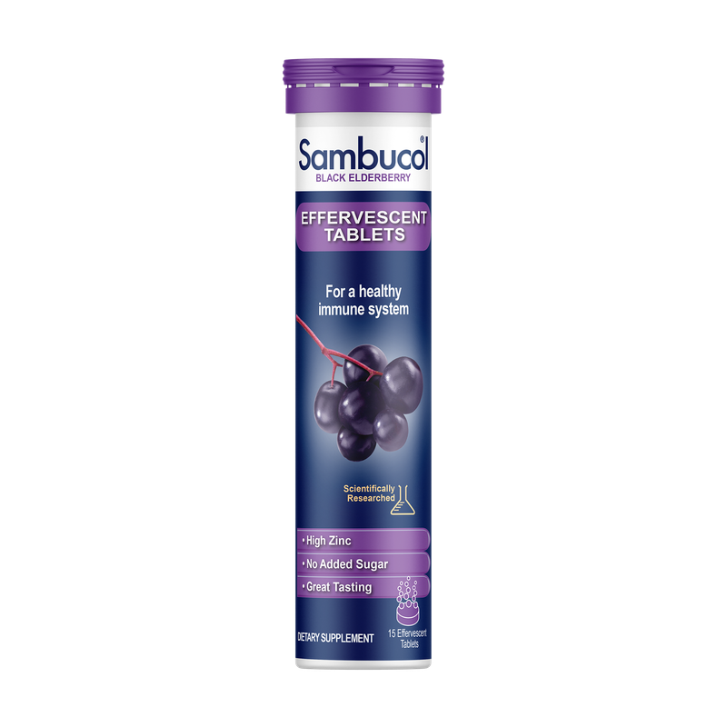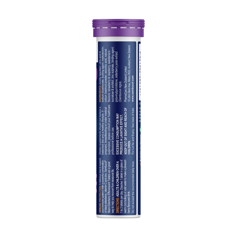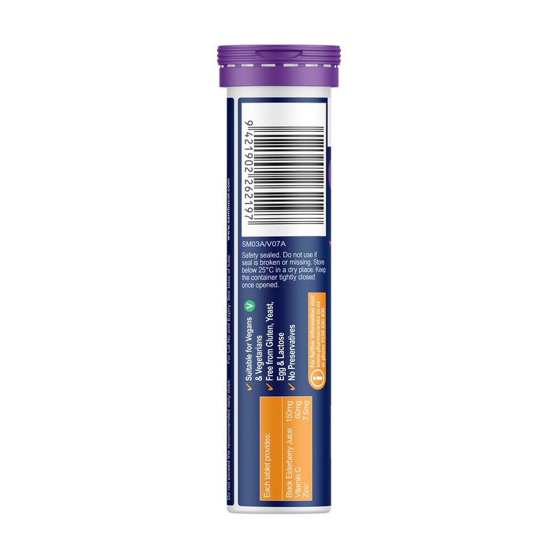 Acidity regulator: citric acid & sodium bicarbonate; bulking agent: maltodextrin; colour: beetroot powder; ascorbic acid; natural flavours: strawberry & raspberry; sweeteners: sucralose & sorbitol; zinc sulphate; binding agent: polyvinylpyrrolidone; elderberry juice extract (Sambucus nigra).